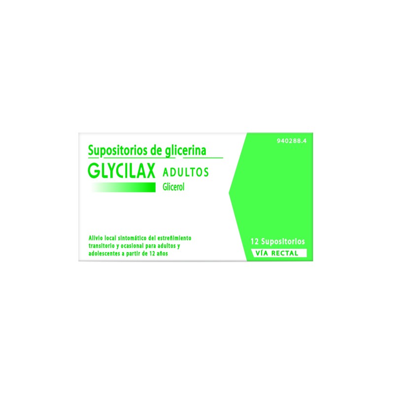 Supositorios Glicerina Glycilax Adultos 3.31g 12 Supositorios están indicadospara el alivio local sintomático del estreñimiento transitorio y ocasional para adultos y adolescentes a partir de 12 años, gracias a su contenido en glicerol, que es un laxante que se administra por vía rectal.