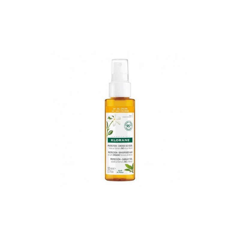 Spray protector para el cabello expuesto al sol compuesto por aceite de tamanu y monoi. Repara el cabello dañado tras una larga exposición al sol.